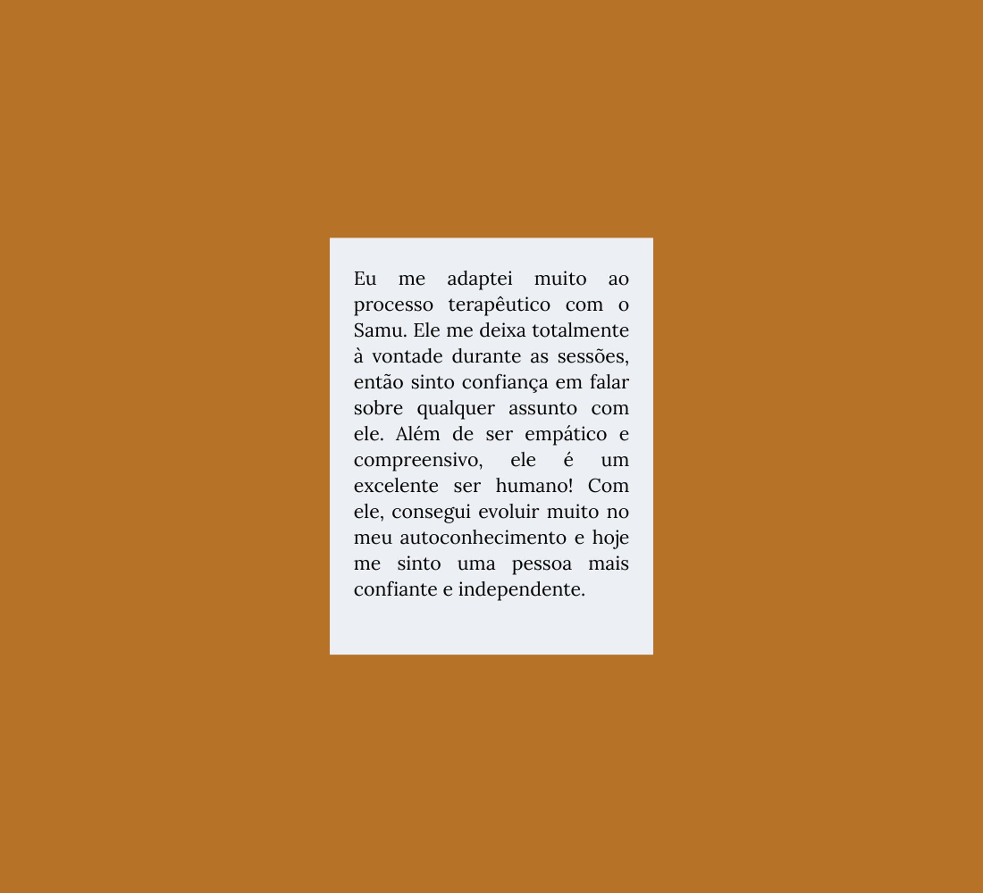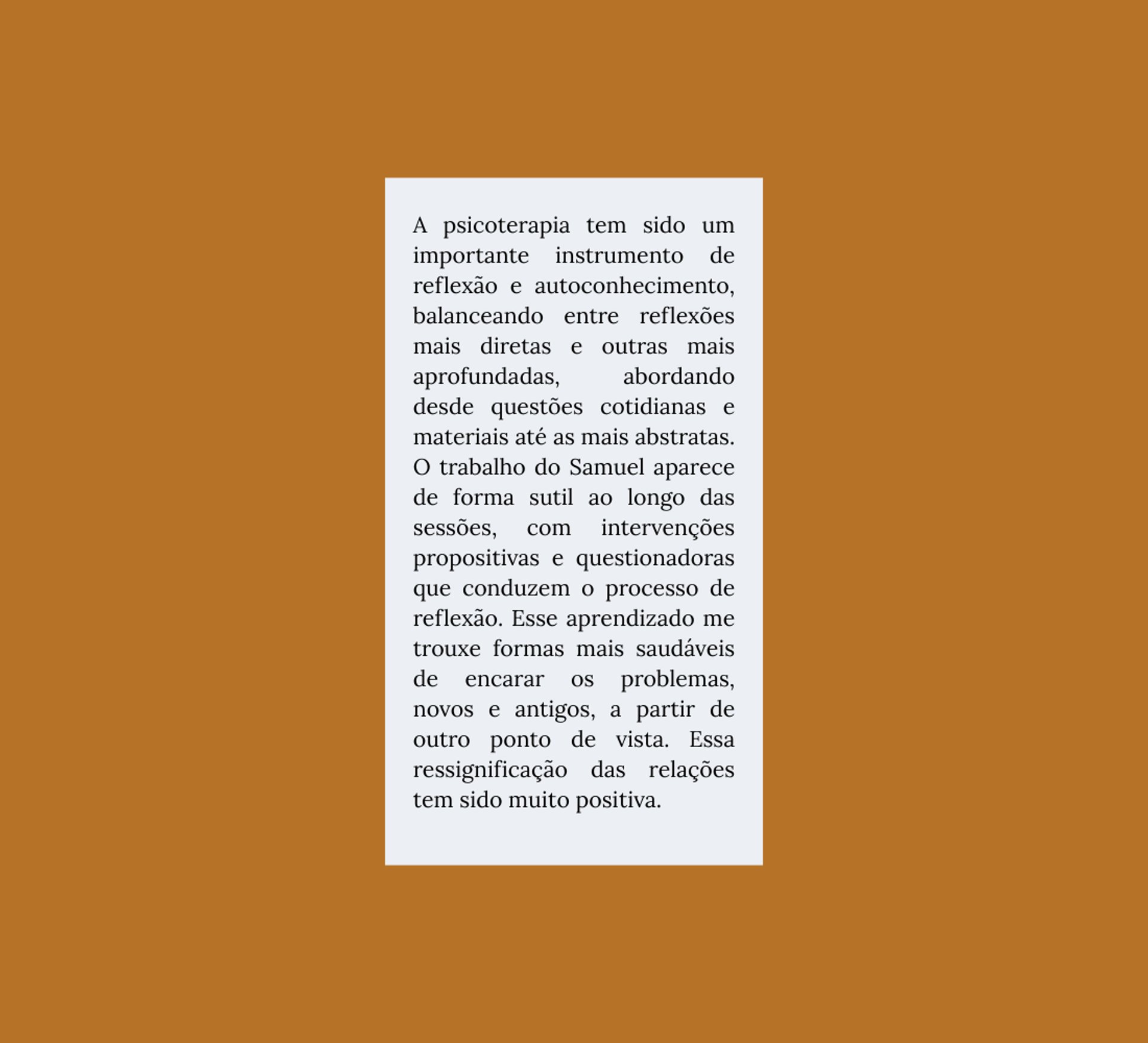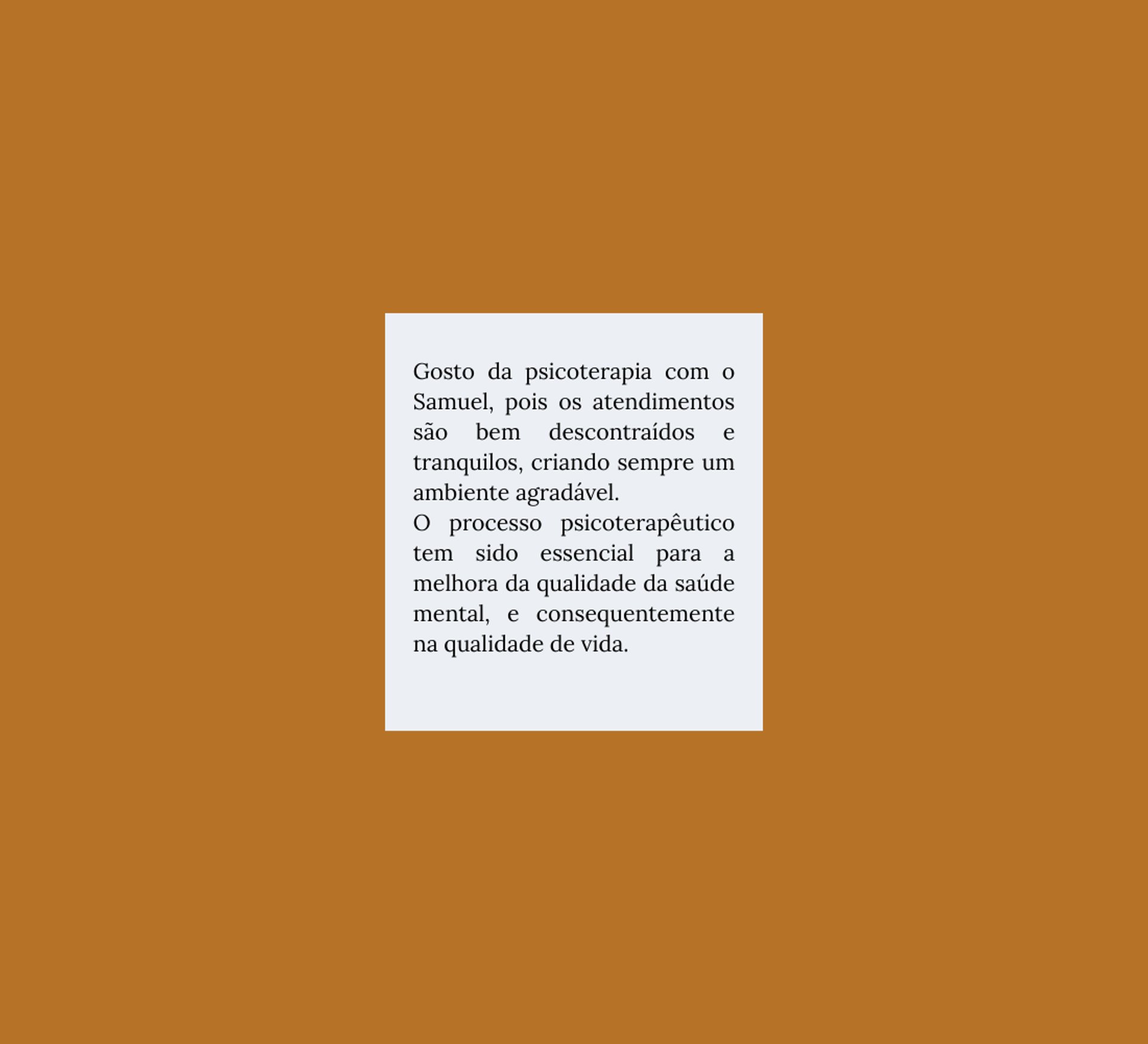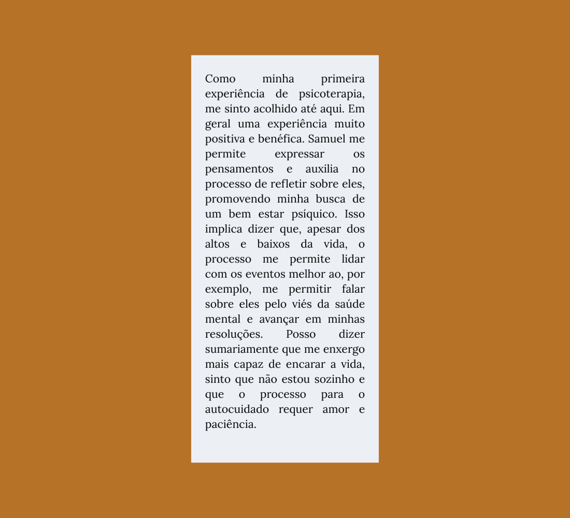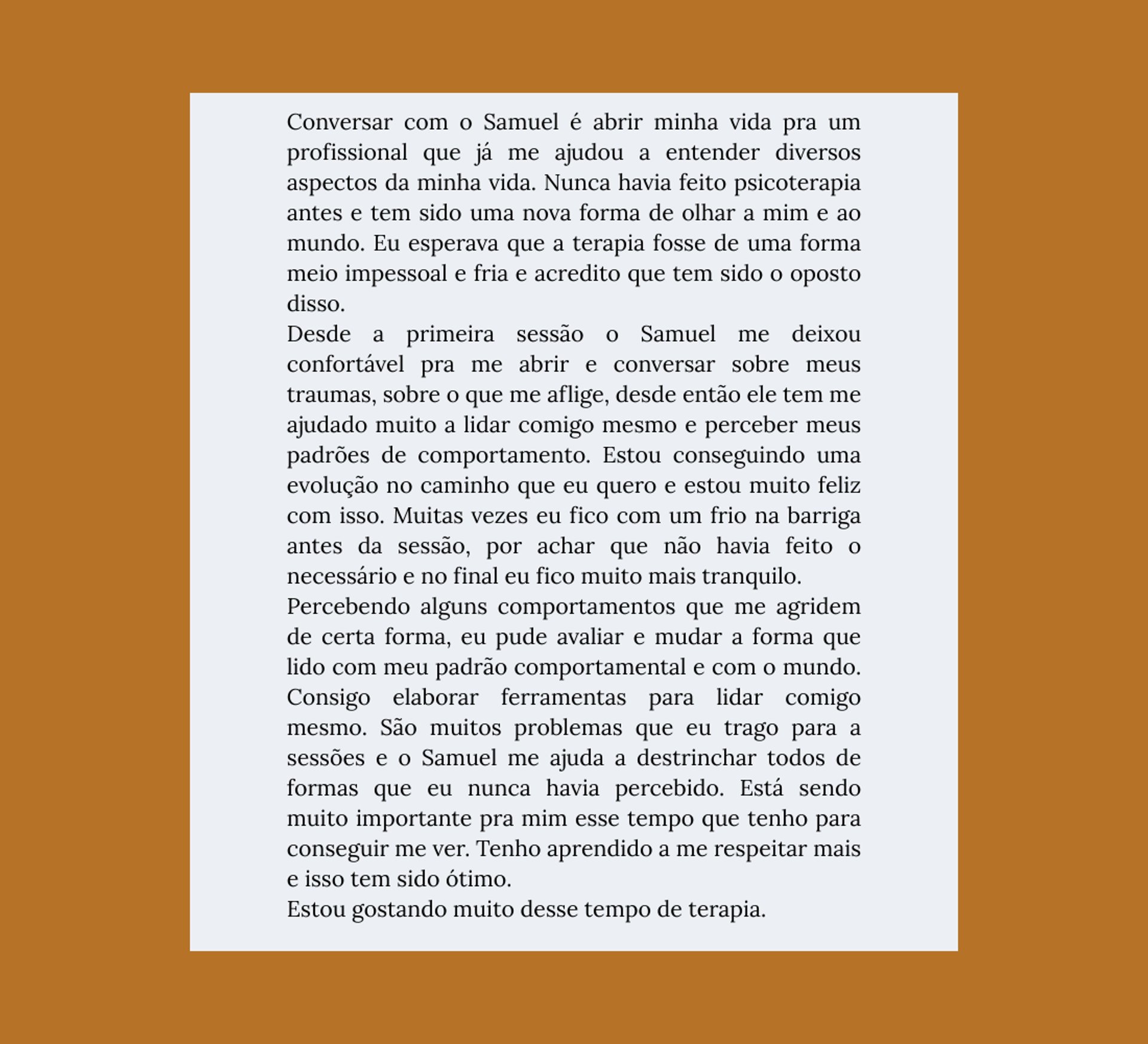 Em minha psicoterapia, as dores e questões que você trouxer serão escutadas, validadas, pensadas e discutidas de um modo que faça sentido para você.